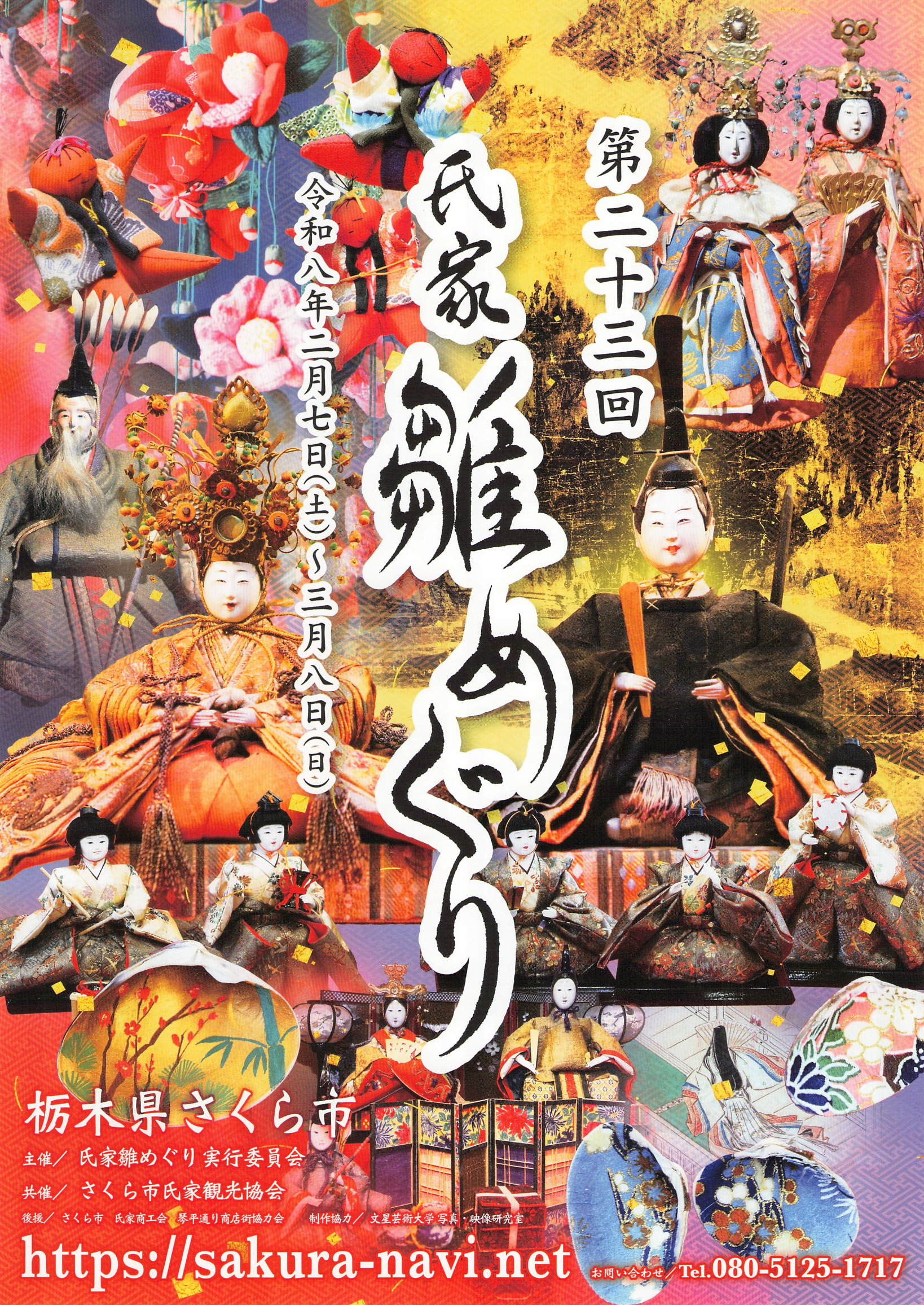 氏家雛めぐりは、氏家駅とさくら市役所周辺の商店街と公共施設、及び個人宅に雛人形と吊るし飾り等を一斉に飾り、県内外から多くの来場者を呼び込み、市街地の活性化とさくら市のPRを目指しつつ、市民交流を図ることを目的としています。
